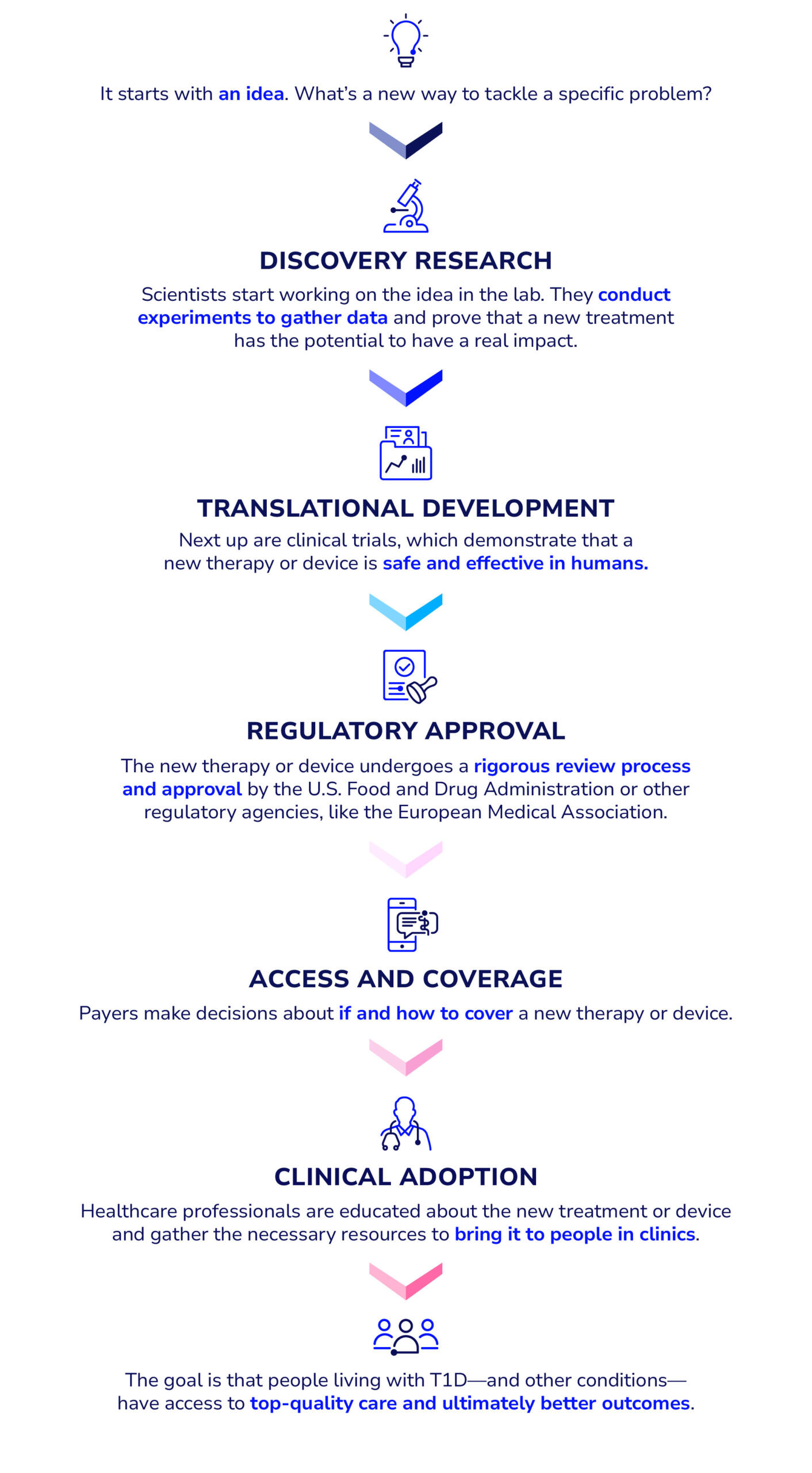 Breakthrough T1D is unique in that we work across the entire pipeline—from start to finish—for every promising therapy or device that we invest in. Between Research, Advocacy, and Medical Affairs, we work at every single step to accelerate progress and get new treatments to people with T1D faster than ever.