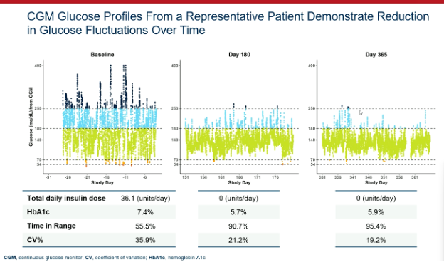 - All 12 participants demonstrated sustained insulin production as measured by C-peptide, reduced external insulin therapy use, and achieved greater than 70% time in range.