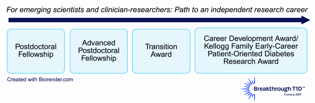 Training awards are a key part of Breakthrough T1D’s grants portfolio. These awards support early-career scientists and clinical researchers to explore promising ideas and encourage trainees to follow career paths that drive T1D research forward. Our approach is designed to provide opportunities to support trainees from an early postdoctoral stage (after receiving a higher degree) to transitioning to an independent lab and career as a T1D researcher.