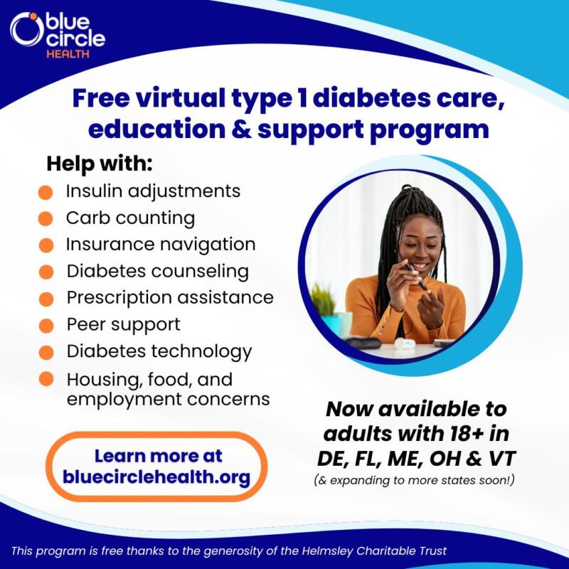 Blue Circle Health is a 501(c)(3) nonprofit organization that provides free virtual care, education, and support for adults with T1D. The program includes medical care, diabetes education, peer support, diabetes supportive counseling, insurance navigation, supplies and medication, and referrals to community resources that can help with access to housing, employment and food.