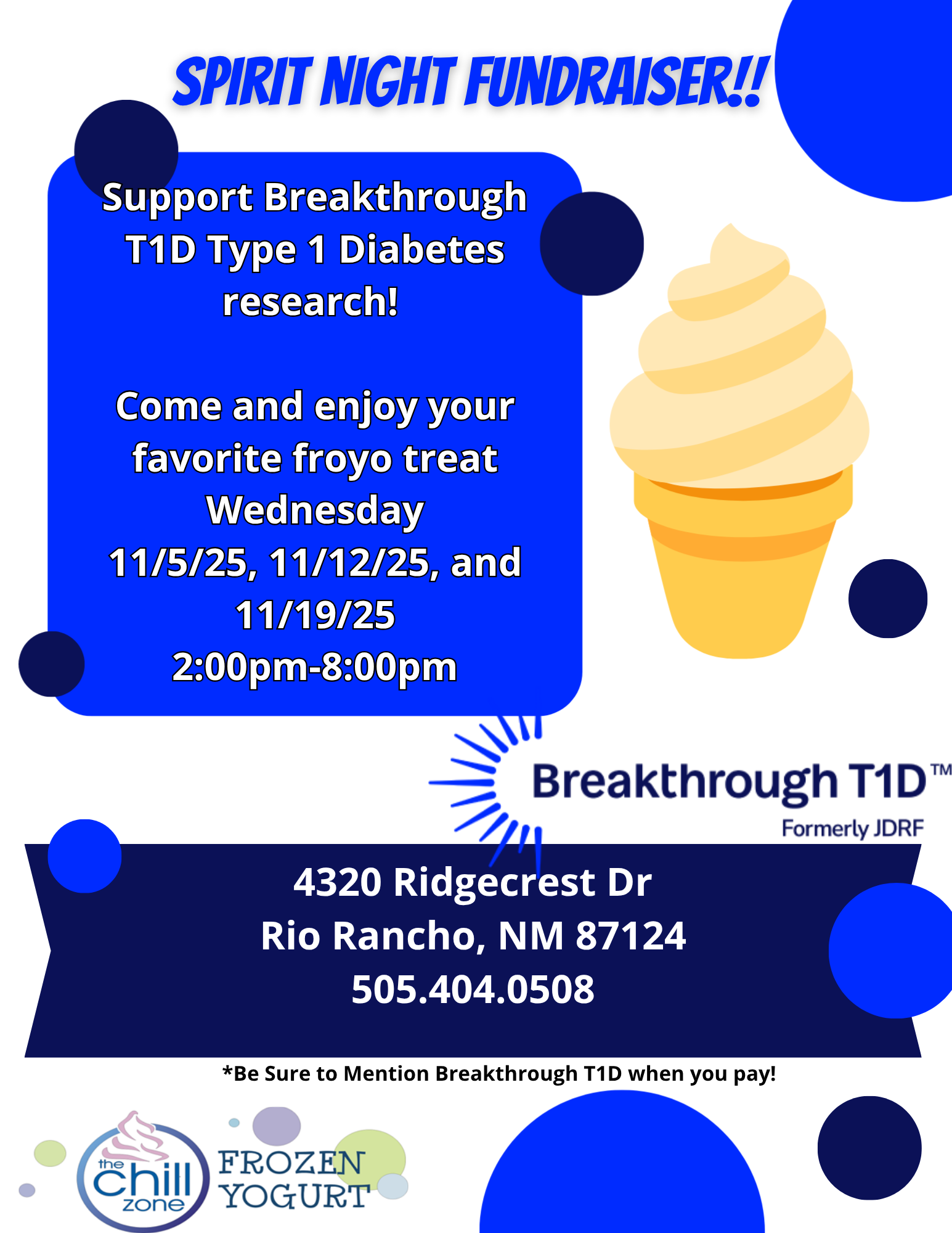 Enjoy your favorite froyo treat on Wednesday 11/5, 11/12, and 11/19 between 2-8 PM and support Breakthrough T1D! Be sure to mention Breakthrough T1D when you pay.