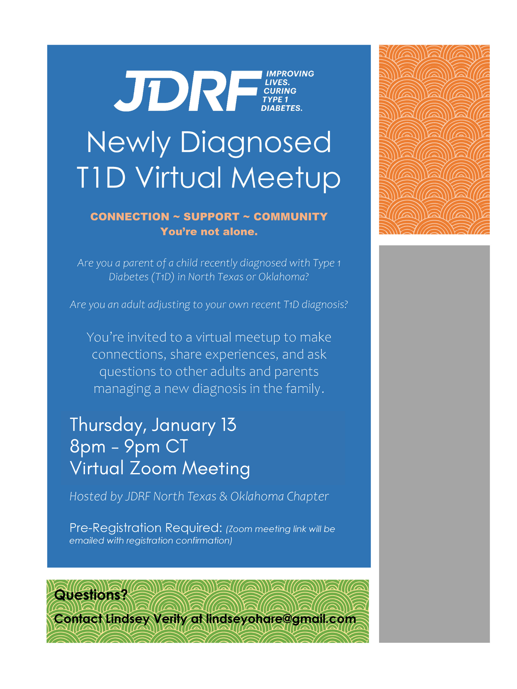 LOCAL monthly Zoom has been added for the North Texas and Oklahoma chapter on the Second Thursday of each month at 8 PM . Join us on Jan 13th to meet other families and learn some tips and tricks to managing T1D! Register here: Register here in Advance