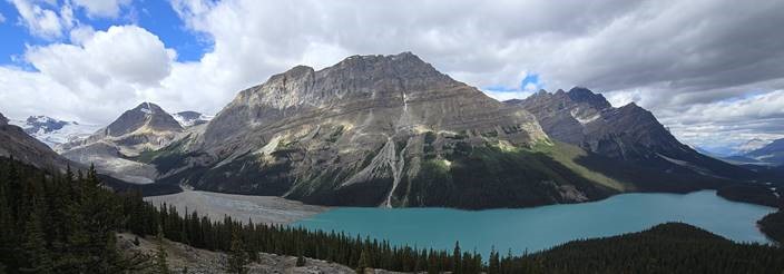 Day 5 was an off-bike day. I took the time to hike around Lake Louise. Day 6 departs from Lake Louise Inn and rides into The Crossings on the way to Jasper. The first half of the ride is all uphill, but there are stunning mountain-scapes and glacier lakes to see along the way. 13 miles in I stop at Hector Lake. 21 miles in I pull over at the Crowfoot Mountain Viewport. Can you see the bluish-white glacier on the left? Then at the summit of the climb at 26 miles is the Peyto Lake Overlook. I swap out cycling cleats for hiking shoes and traverse 300m to the overlook platform. Wow! The glacier feeds the lake and it has that fluorescent turquoise color indicative of the lakes in the area. I learned that the blue color comes from the rock silt brought in by the glacier. The silt reflects blue frequencies and absorbs the other colors. Whatever the physics behind it they are beautiful to see.