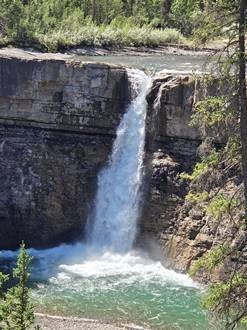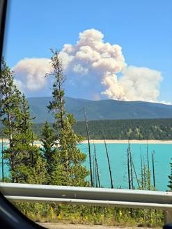 The ride is complete but the adventure is still underway. We travel by van to a trail head where we can see two cascading waterfalls. There is also a trail there to a lookout. I missed the memo that we were supposed to only look at the waterfall and not go on the hike. After 0.5 miles without seeing anyone I figured I better turn around. Yep, I was “that guy” who held up lunch for the group. After lunch we noticed on the drive the billowing smoke rising above the mountain. Those are not clouds; it is smoke. You can spot the hint of orange which is the fire itself burning. We are getting the heck-out-of-Dodge and heading to Banff.