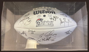 Calling all Patriots fans! The 2001-2002 season has gone down in history as one of the most important years in New England sports history. After starting quarterback Drew Bledsoe was injured, a second-year unknown quarterback named Tom Brady stepped up and led the Patriots all the way to their first Super Bowl, defeating the St. Louis Rams to take home the Lombardi Trophy. Take home a piece of this historic season with this football signed by the entire 2001-2002 New England Patriots team! Generously donated by Lisa and Neil Wallack.