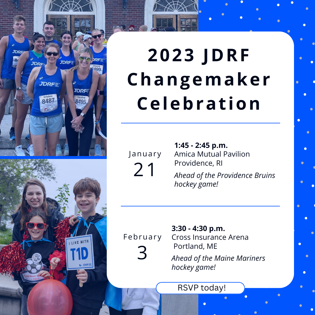 Ahead of the Maine Mariners hockey game, participants will be invited to join us for a private reception at the Cross Insurance Arena. Be sure to purchase your tickets by visiting https://fevo-enterprise.com/event/JDRFFeb3rd. Make it a full day by joining us at the Type 1 Diabetes Summit Presented by Breakthrough T1D and Maine P-Pods from 12 – 3:30 p.m., registration coming soon!