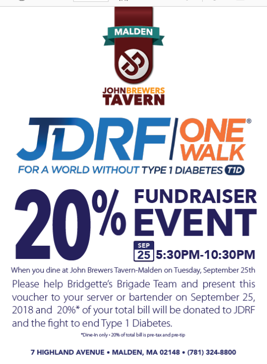 Dine with Boston Walk Team, Bridgette’s Brigade on September 25, 2018 from 5:30-10:30 p.m. at John Brewer’s Tavern in Malden and 20% of your total bill will be donated to Breakthrough T1D! Present flyer above.