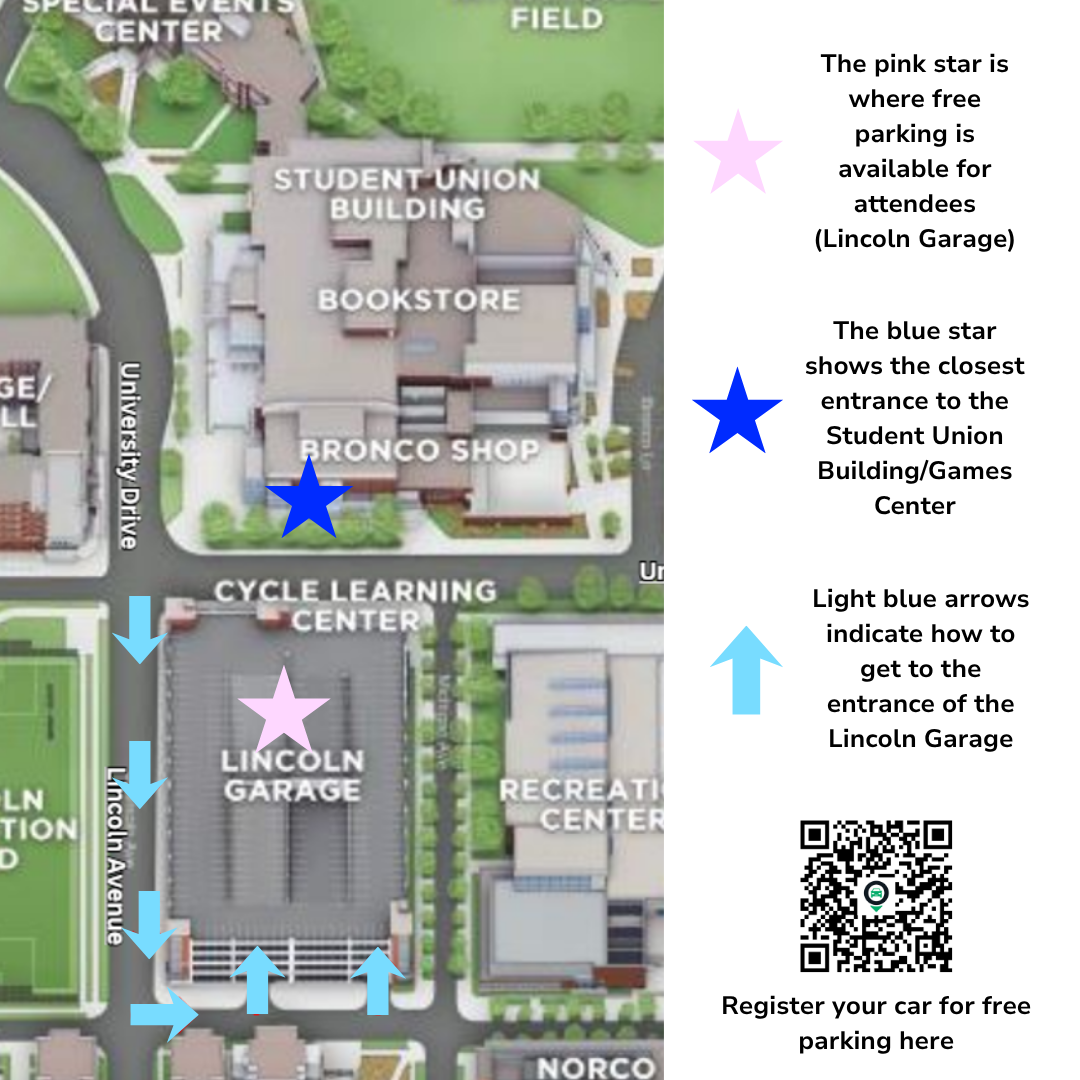 Arrival: Once parked, please direct to the Student Union Building across University drive. Using the “Entry 5” doors, you will be inside the Games Center. Keep walking down the hallway and stop before reaching the Starbucks. There will be a large staircase on the right side of them. Go up to the 2nd floor using the staircase, then turn left and continue down the hallway until Hatch AB appears on their right side.