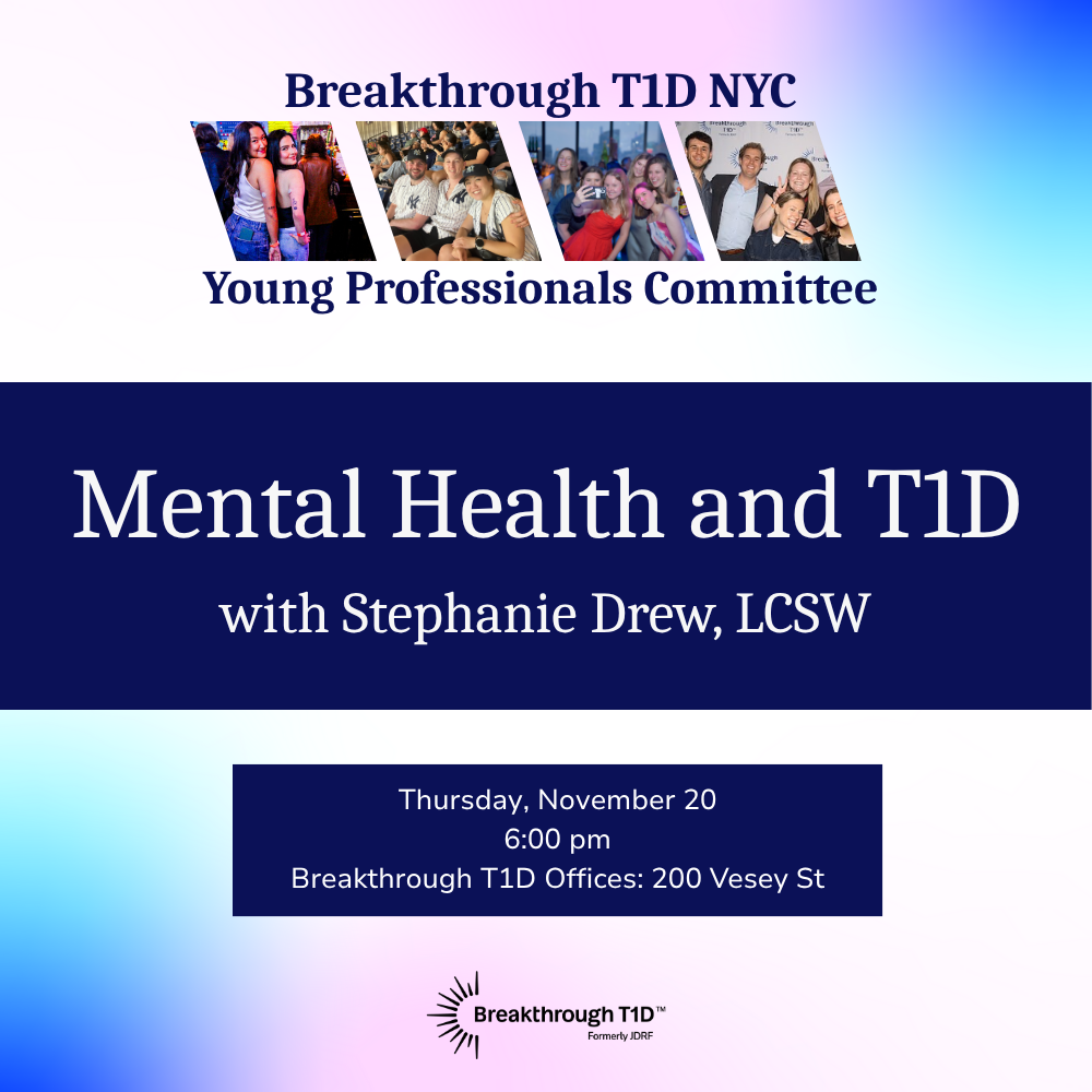 The Young Professionals Committee will host a conversation on mental health and type 1 diabetes (T1D) on November 20th, featuring Stephanie Drew, LCSW. Join us as we discuss how to show up for ourselves and our loved ones living with T1D.
