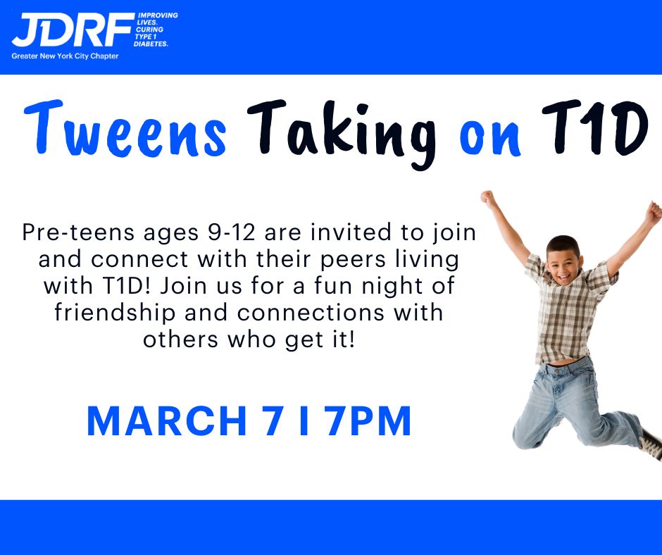 Young people ages 9-12 are invited to join virtual meet ups with fellow pre-teens living with T1D. Join us for a fun night of friendship and connections!