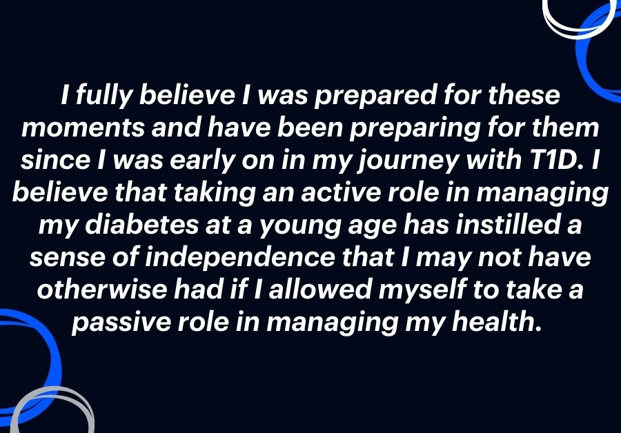 Regarding the general stress of law school, I believe it has reinforced my priority system and what comes first in my life. The answer will always be my health. No matter how many times I will be reminded of this, it is a lesson I am happy to revisit. It is very easy to get caught up in what’s going on in your personal, work, or academic life and this will always be true. From the early days of when I was first diagnosed, to when I went away from home for college, and now in law school; I have been able to see challenges appear in all three of these areas. In every situation, regardless of how many times you may falter in your care or need a reminder, know that stepping back and prioritizing your well-being is not only important but mandatory for a healthy life, whether you have T1D or not.