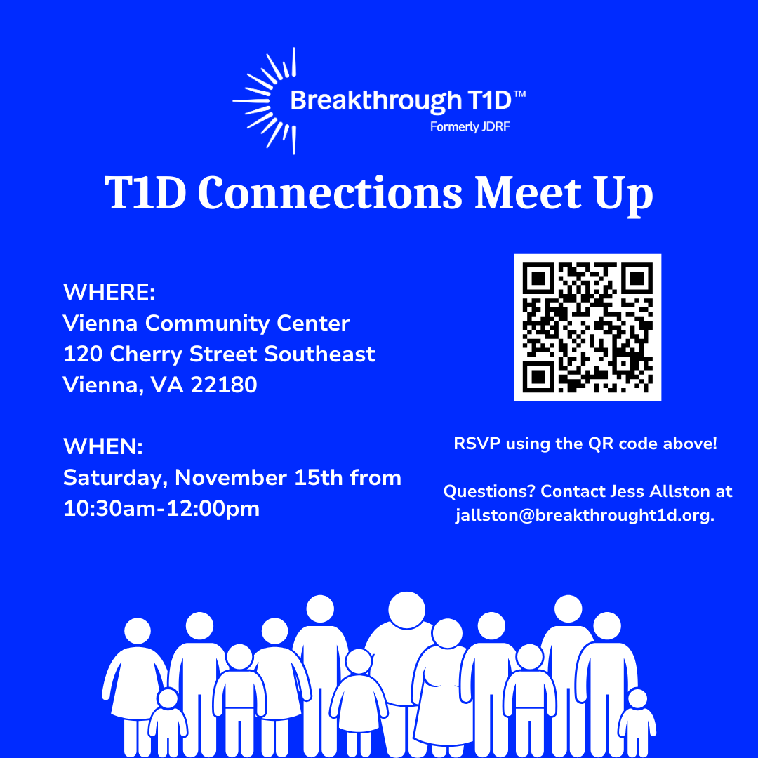 Breakthrough T1D Mid-Atlantic volunteers are hosting a community meet-up at the Vienna Community Center (120 Cherry St SE, Vienna, VA, 22180) on Saturday, November 15th from 10:30am-12:00pm!