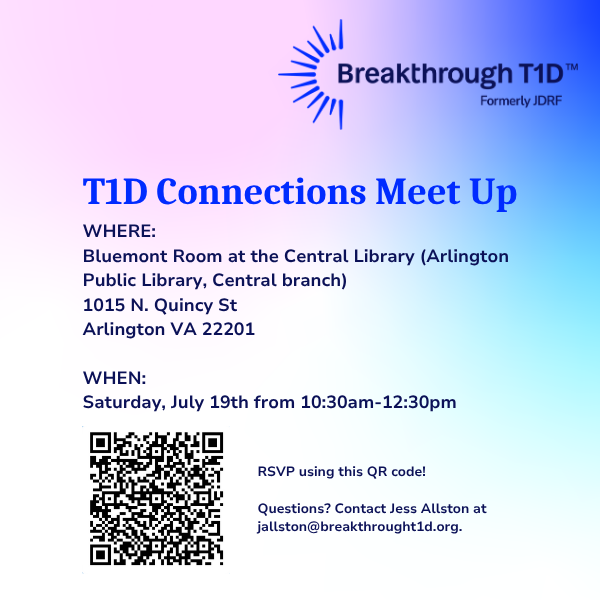 Join Breakthrough T1D Mid-Atlantic volunteers for a T1D community meetup at Central Library in Arlington on Saturday, July 19th from 10:30am-12:30pm.