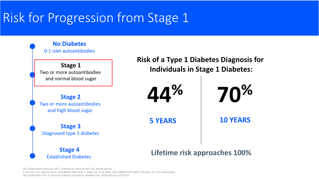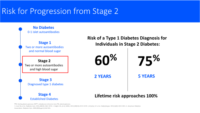 When blood is tested, we are looking for these autoantibodies. If zero to one autoantibody is detected the person has no diabetes and no increased risk. With stage 1, there are two or more persistent autoantibodies to the insulin producing cells in the pancreas. It is now known that this person over their lifetime will progress to stage 3 clinical T1D. In stage 1, people will have a normal blood sugar. Stage 2 is where there are two or more autoantibodies, and high blood sugar, usually after meals. Stage 3 is the classic diagnosis of T1D usually with symptoms. At some point after established T1D, there is no remaining beta cell mass. This is why stage 1 is very important. It is known from long standing studies that the risk of progression at the five -year mark shows 44% have gone on to develop T1D, at the 10-year mark 70% will be diagnosed with stage 3 T1D and require insulin. The lifetime risk approaches 100%. In stage 2, is where we see dysglycemia or hyperglycemia usually following meals. When stage 2 occurs the risk of T1D diagnosis accelerates. We see the time compressed to 60% of people who will be diagnosed in two years and 75% in five years. Again, the lifetime risk approaches 100%. When we can find people in stage 1 and 2, this is when there is the opportunity to intervene to slow or halt the disease. We cannot know if people are forming these autoantibodies in the presymptomatic stages unless they are screened. This is why a screening program is so important.