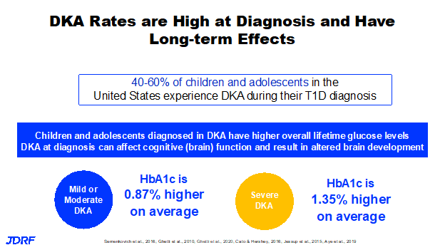 T1Detect as our guiding principles will reduce the incidence of diabetic ketoacidosis (DKA) at diagnosis. It is important to identify individuals for prevention or disease modifying therapy research studies. The first disease modifying therapy, teplizumab(Tzield), for T1D was approved recently. DKA rates are high at diagnosis in the United States. DKA prevention at diagnosis alone is sufficient to drive the importance of the T1Detect program. In the United States, DKA rates at diagnosis are between 40 and 60%. For children and adolescents, they are higher among racial and ethnic minorities. The rates in the United States are much higher than countries in Europe and Australia. We do lack data, especially for adults. We do see when following children and adolescents who are diagnosed in DKA, they do have higher overall lifetime glucose levels.