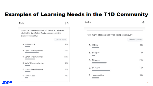 An example of this is a virtual Type One Nation (TON) summit this past October that was well attended where people were engaged and participating. In 2023, the goal is to have an educational component at ten of these TON events around the country where there will be discussions about screening. This is being presented in an interactive way. This way there will be some Q and A where there can be presentations of both familiar material and also things people need more information about. It will have a fun interactive format, similar to a game show including prizes. Look for notices for these new events and please attend. In the polling that Breakthrough T1D has done at recent virtual events, many who attended were interested in screening. In the interactive quiz only a small minority of attendees knew the correct answers on screening and that if you have a family member with T1D you have a 15 times higher risk of developing T1D. There was a lot of confusion around the staging of T1D. Fifteen percent of the participants said they had no idea how many stages there were and many thought there was only 1 not 3. Breakthrough T1D is working to help make sure people understand the staging and understand the importance of screening.