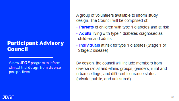 The Participant Advisory Council is new to Breakthrough T1D. Breakthrough T1D gets a lot of requests from study investigators, from startup companies and the T1D therapeutic space, who say, we are designing a study and we would love to talk to someone with T1D, or someone with presymptomatic stage one or stage two T1D, or a parent of a very young child with T1D, to understand what study design would be acceptable, and would it make sense for that individual or parent. This Participant Advisory Council is a group of volunteers to inform study design. This will consist of parents of children with T1D or have children at risk, those that are antibody positive, adults living with T1D who were diagnosed as children or adults, and individuals at risk for T1D and are in stage one or two. The need is to represent all on this council. There should be people form diverse racial and ethnic groups, genders, rural and urban settings, also with different insurance status, public and private insurance. There will be more about all of this in 2023.