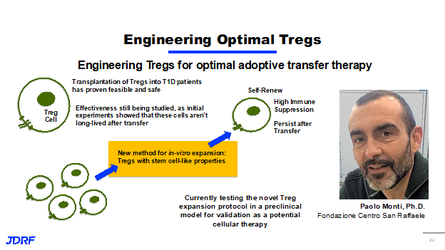 Finally, Breakthrough T1D funds research around the world and a great example is the work being done by Dr. Paolo Monti, PHD, at San Raffaele Scientific Institute in Milan, Italy. Breakthrough T1D funded Dr. Monti through his postdoctoral fellowships, through career development awards, and all of which were very successful and resulted in the ongoing work in his lab that Breakthrough T1D is also funding. He is focused on identify and developing T regs that are optimal for immune suppression. Past work in Dr. Monti’s lab has shown that transplantation or putting T regs into T1D patients is both feasible and safe. You can place these cells into patients and they do shut down the immune response. However, initial experiments haven’t been overly successful because it shows that these cells while they initially have an effect on the immune system, they aren’t long lived after transfer. So they do not last very long in a recipient. More work is needed to make this an effective approach to having lasting immune tolerance. Dr. Monti’s ongoing work has taken T cells from those with T1D. He has developed a new method in this laboratory for expanding and activating these cells in vitro, meaning outside of the body or basically in a test tube or lab plate. This new method that Dr. Monti has developed, gives these T regs, stem cell like properties. When he takes these T regs and puts them back into his model system, he shows that they can self-renew. They continually make copies of themselves, so they stay around. They also have a very high immune suppression potential, meaning that they work even better than normal T regs. They persist after transfer, meaning that this is potentially getting past our issue with T regs not being long lived. This could be a lasting therapy for those with T1D. Dr. Monti is currently testing this novel protocol, in a preclinical model and validating it as a potential cellular therapy in clinical trials. The hope is that this discovery research that Breakthrough T1D is funding leads to the future therapies, the future clinical trials. The takeaway message is that Breakthrough T1D is funding discovery research in the US and around the world, Work is being done to develop a wide variety of approaches in multiple parts of the immune system to prevent or stop the immune attack on beta cells, and eventually develop a cure for type one diabetes.