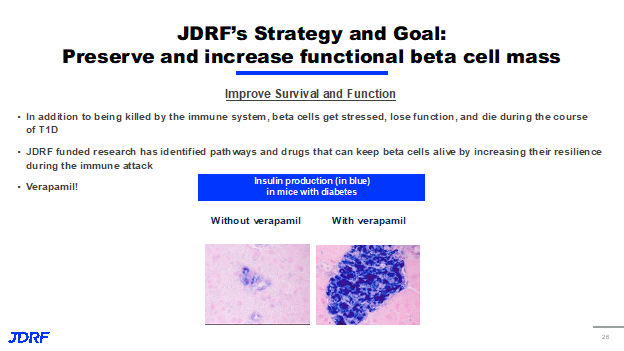 The focus for Breakthrough T1D, is in trying to protect the beta cells and encourage more beta cell growth. In thinking of the four distinct stages of T1D, currently most disease modifying therapies are targeted at the stage three population, that’s due to a number of reasons. One of them being that many individuals in stage three still have a measurable number of beta cells remaining. Thus, there’s a reasonable number of targets to deliver a drug to. These projects are starting in the stage three population, the goal is these beta cell focus strategies will help those in all stages of T1D, including those with established T1D in stage four, who may only have a very small number of beta cells left and those in stages one and two, keep them from progressing to insulin dependence. The first approach is centered on finding new ways to improve the survival and function of beta cells in response to stress and the attacking immune system, not every beta cell dies solely due to the immune system, and when the beta cells are stressed, they can begin to lose function and ultimately die during this time. Previous Breakthrough T1D research has identified several different pathways and drugs that can keep beta cells alive and functional by making them more resilient to the immune attack. An example of a drug that we think does this is Verapamil. Verapamil is a drug primarily used to treat high blood pressure. But in mice with diabetes, it has been shown to reduce beta cell death, which you can see in the figure below. Diabetic mice that were not given. Verapamil had much more beta cell death and a significantly less insulin production than those that received the drug. Currently, Breakthrough T1D is supporting Verapamil investigation in clinical trials to see if that same protective impact is seen in humans.