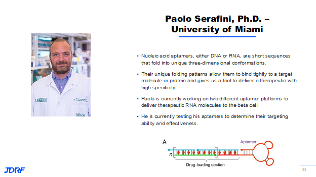 The final topic is a company from the T1D fund called Code Bio. Code bio is using scaffolds made from slightly modified DNA to serve as a customizable drug delivery platform. There is a DNA scaffold framework, the double stranded helix can then be customized with different antibodies, different drugs, different imaging agents, thus many possibilities. It is really this flexible nature of the platform that makes the Code Bio scaffold so exciting because in addition to all of the different therapies that can be attached, this can be modified with almost any type of targeting agent that confers specificity to the beta cell. This could be a peptide and antibodies, small molecule, numerous different options. In summary, current targeted drug delivery approaches are predominantly in the proof of concept stage in T1D, but at Breakthrough T1D and across the field all are working to keep them moving forward. Right now, Some of these projects include nanoparticle delivery platforms, additional viral gene delivery methods, antibody drug, conjugates, and so on. We haven’t ignored the immune system in this targeted drug delivery space as well. We are looking at how these targeted delivery strategies can be applied to the immune system and how the lessons being learned around targeting beta cells can also be applied to immune cells as well. And looking forward. The future of disease modifying therapies is very promising. Breakthrough T1D will continue to identify discovery research that focuses on new and expanding areas of immune intervention work to develop new combination therapies for type one diabetes that addresses both immune dysfunction and beta cell function. In addition, to continue to find and expand the number of targeted drug delivery approaches we have for both the immune system and the beta cell and really continue to drive discovery research into the clinical setting with the goal of developing a cure for T1D.