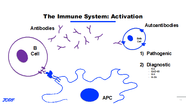 The immune system is very complex. There are three cell types in our immune system that recognize antigens presented by antigen presenting cells. These are B cells, types of T cells including T effector cells (Teffs), and T regulatory cells (Tregs). When a B cell recognizes an antigen that’s being presented, it activates and produces antibodies. These antibodies are small Y shaped proteins that also identify, target and recognize antigens. These cells go out and tag these antigens for destruction by the immune system. It is like displaying a flag saying it is time to get rid of it. In autoimmunity, it is your own cell or antigen on your beta cell that is a protein or antibody and is now called an autoantibody. These autoantibodies can be pathogenic, meaning that they can mark your cells for destruction and lead to further immune activation and further progression of T1D. Some of these autoantibodies are considered diagnostic and they do not necessarily activate the immune system further. The diagnostic part is that they are an indicator that your immune system has already started to recognize your beta cells and there is a mounting immune response against them. Some of the common diagnostic autoantibodies in T1D are ICA, GAD65, IA-2, IAA’s and IA-2A. These are the autoantibodies screened for in stage one and stage two of T1D.