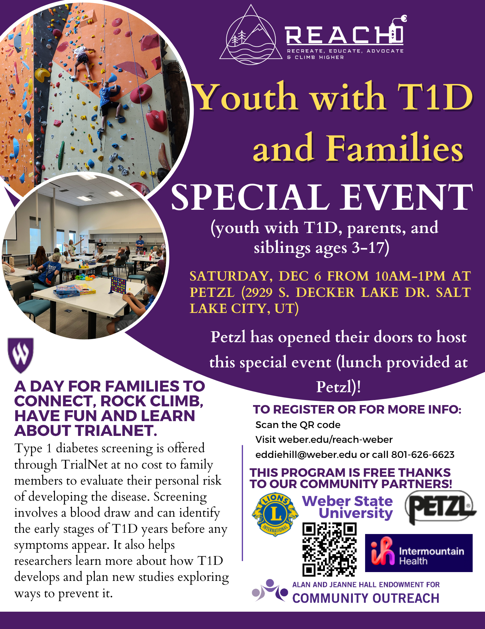 The Recreate, Educate, Advocate, and Climb Higher (REACH) program is a recreation service for youth with type 1 diabetes (T1D) and their families. REACH at Weber State University (WSU) provides fun and innovative recreation programming that combines positive youth development and diabetes education.
