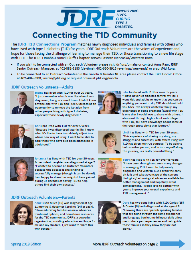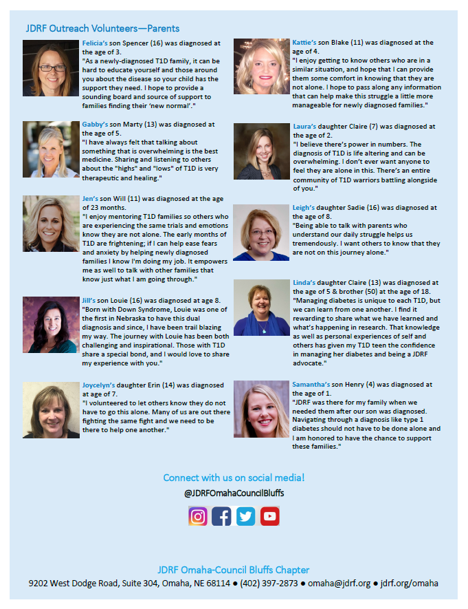 You do not need to feel alone in your journey. Once you make a request, a Breakthrough T1D Outreach Volunteer will reach out to you. If you wish to be connected with an Outreach Volunteer, click HERE or contact Anna Raur, Breakthrough T1D Senior Outreach Manager, at 402-881-3183 or araur@BreakthroughT1D.org.