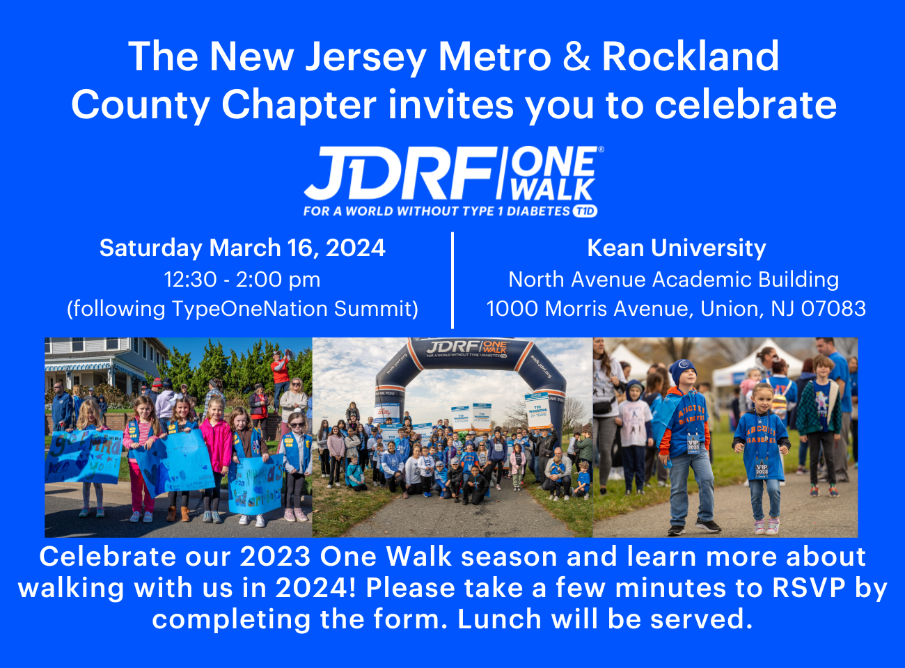 Join us on Saturday, March 16 following TypeOneNation Summit to commemorate a great One Walk season and prepare for 2024! Our One Walk Celebration will be held between 12:30 – 2 pm, which will include an awards ceremony, games, lunch, and more.