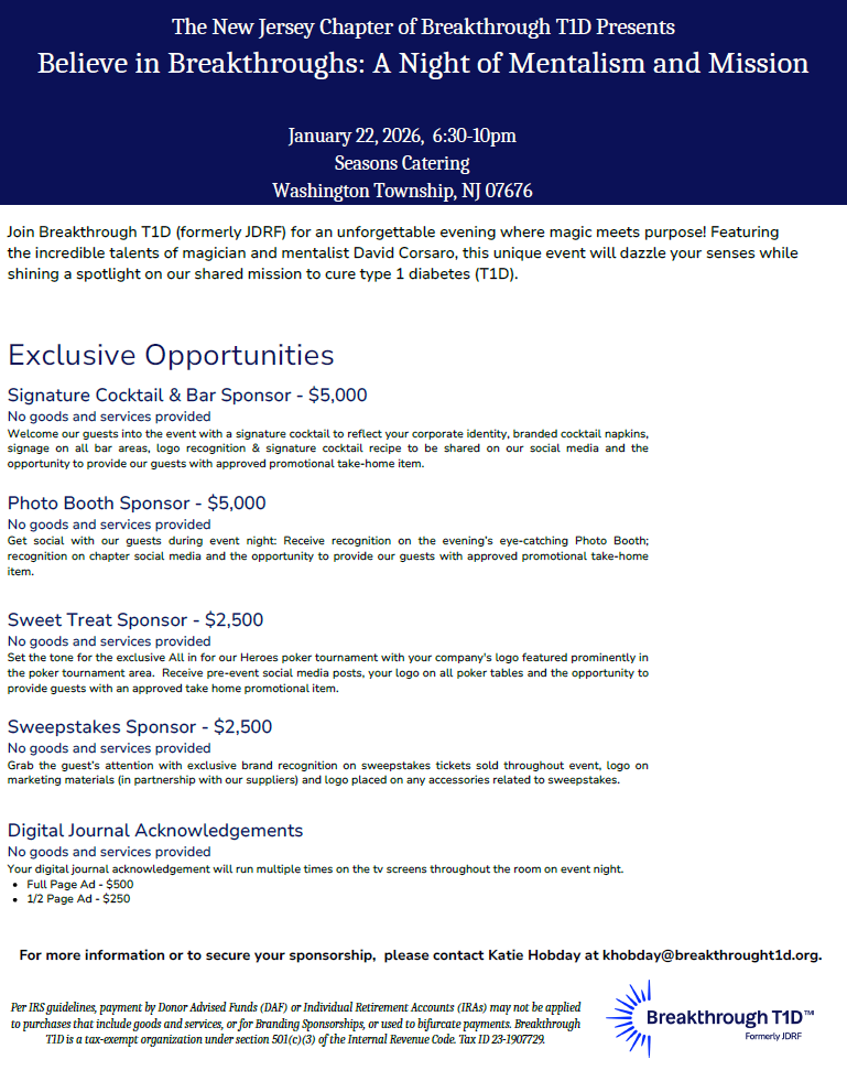 Join us for an unforgettable evening at Believe in Breakthroughs, where inspiration meets entertainment! The night will begin with a lively cocktail hour featuring an open bar and a silent auction filled with exciting items to bid on. Guests will then enjoy dinner followed by an extraordinary performance from David Corsaro, a world-class mentalist and proud T1D dad. His mind-bending show—packed with jaw-dropping illusions and audience engagement—is perfect for guests ages 13 and up.