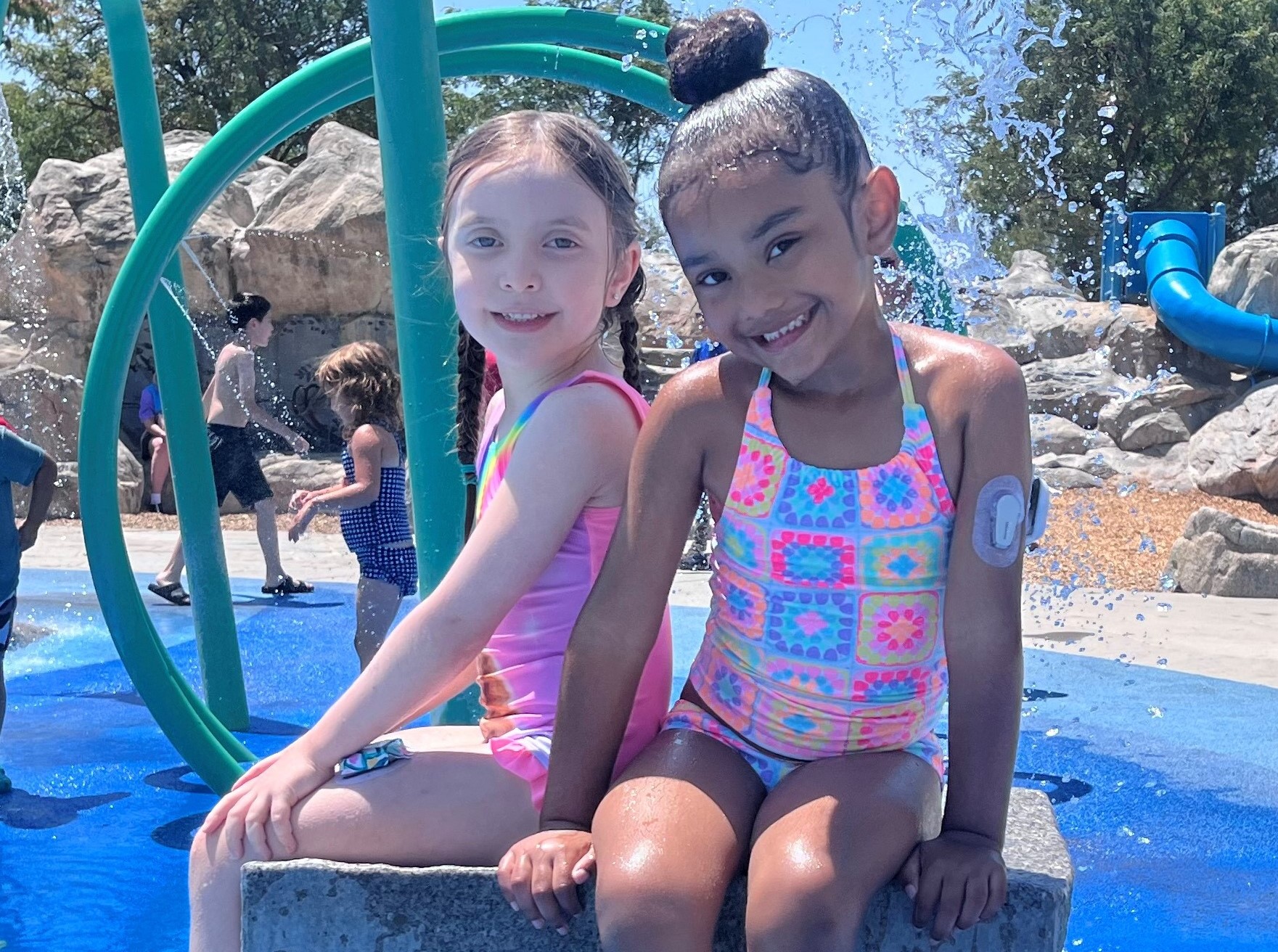We first met over the summer at a playdate for kids with T1D. It was a sunny day at a water park, and we were a little bit nervous because we didn’t know anyone. But then, something amazing happened – we spotted each other’s diabetes gear! Mikala had her continuous glucose monitor, and Remi had colorful stickers on her pump. We talked and splashed in the water, and suddenly, having T1D wasn’t lonely anymore.