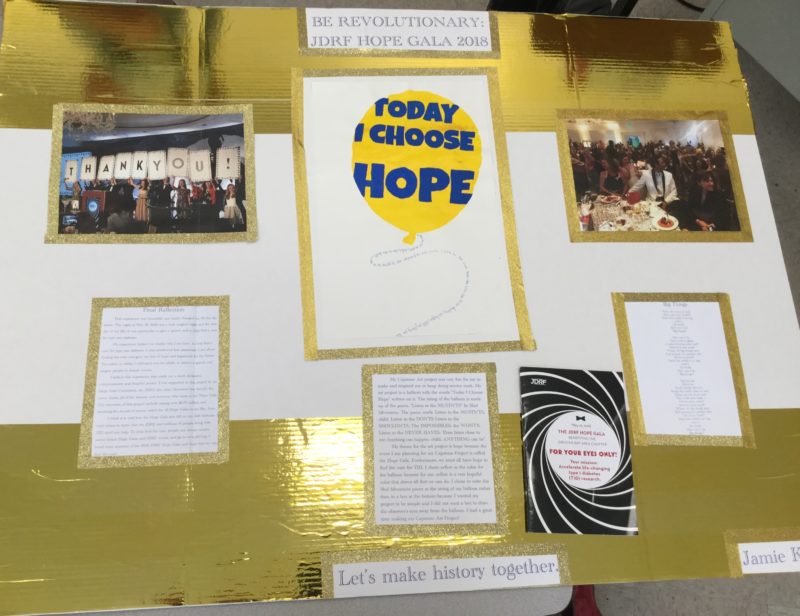 My art project is a balloon with the words “Today I Choose Hope” written on it. The string of the balloon is made up of the poem, “Listen to the MUSTN’TS” by Shel Silverstein. The poem reads: Listen to the MUSTN’TS, child, Listen to the DON’TS Listen to the SHOULDN’TS, The IMPOSSIBLES, the WONT’S, Listen to the NEVER HAVES, Then listen close to me-Anything can happen, child, ANYTHING can be”. (I am such a quote geek.) My theme for the art project is hope because the event I am planning for my Capstone Project is called the Hope Gala. Furthermore, we must all have hope to find the cure for T1D. I chose yellow as the color for the balloon because for me, yellow is a very hopeful color that shows all that we can do.Here is a picture of my trifold with my art project in the middle: