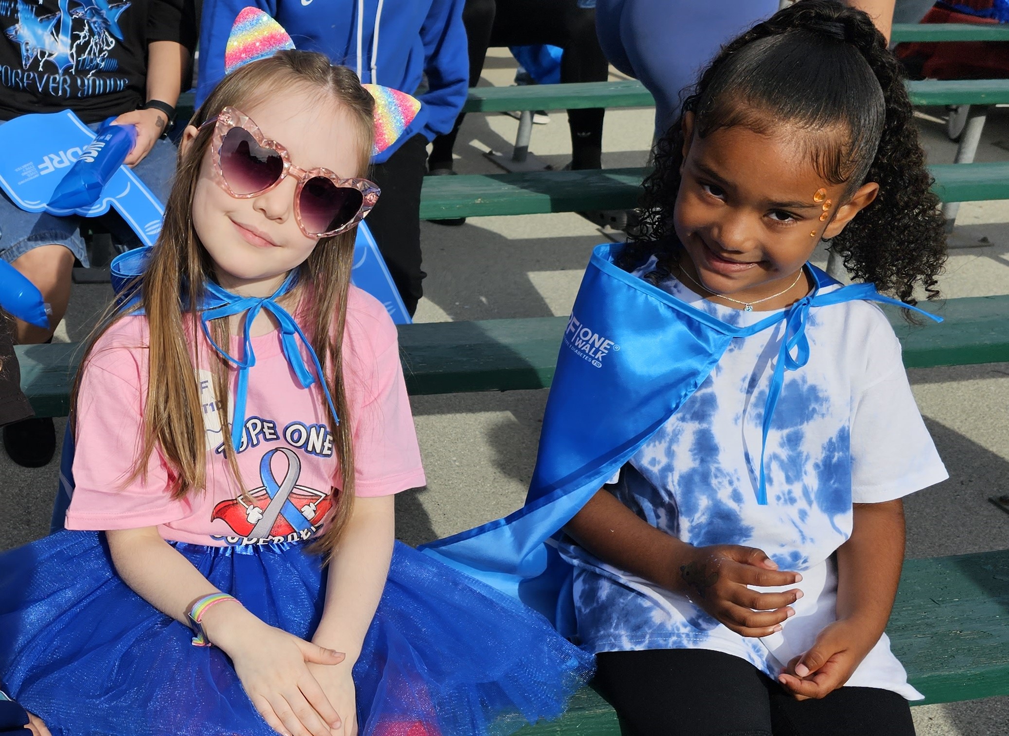 Now, we want to tell you about something else super cool that happened earlier this month – the Breakthrough T1D One Walk! It was the first Walk for both of us, and we couldn’t believe how many people were there to support finding a cure for T1D. It was so fun to meet other kids with T1D and get our faces painted and play games. We both walked in the T1D Parade wearing our superhero capes and everyone cheered for us!