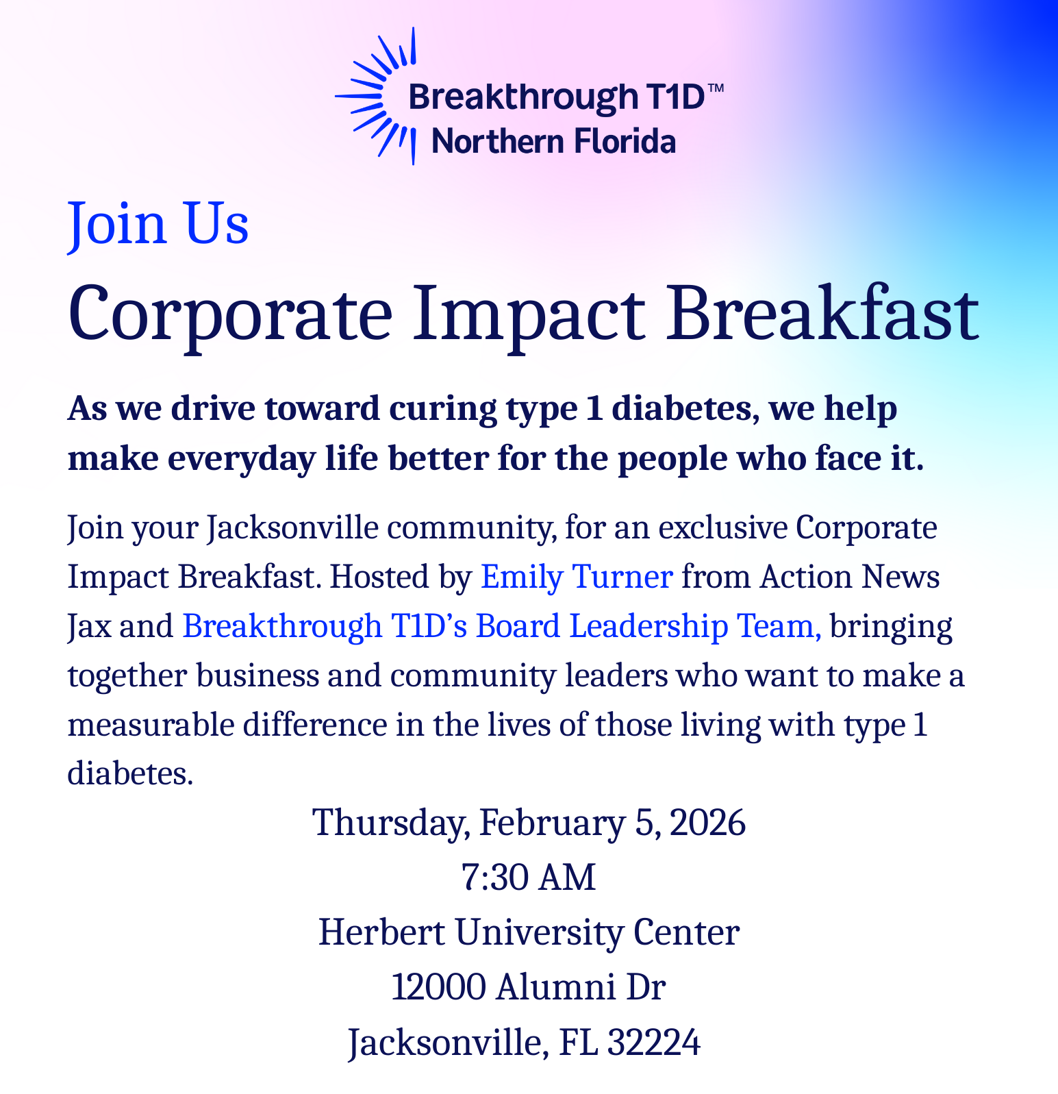 Hosted by Breakthrough T1D’s Board Leadership Team, alongside Emily Turner of Action News Jax, this morning conversation will highlight how corporate leadership can drive meaningful change for those living with type 1 diabetes—and help turn today’s breakthroughs into tomorrow’s cures.