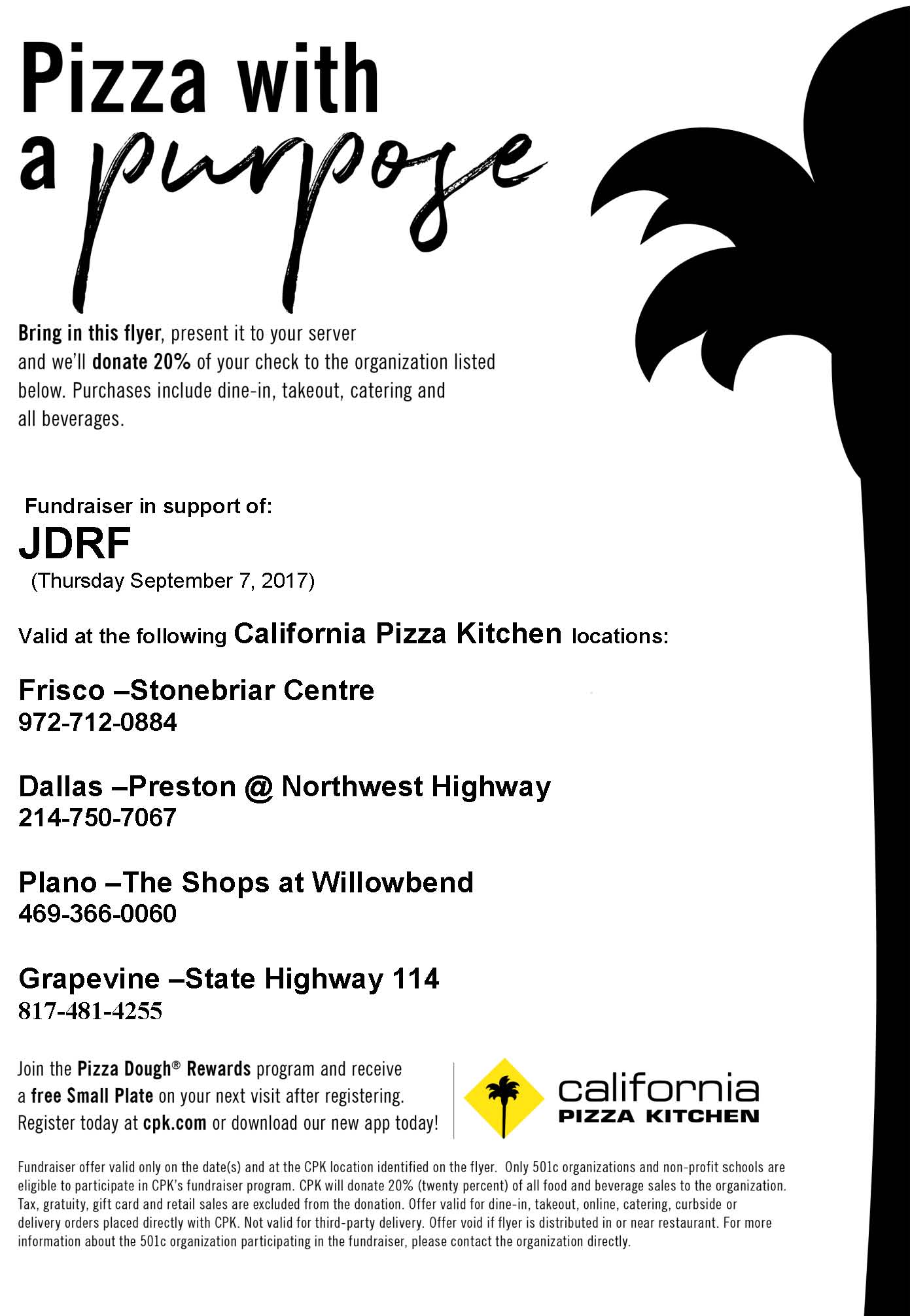 On Thursday September 7th, bring in this flyer to the following California Pizza Kitchen locations and 20% of your check will be donated to Breakthrough T1D! Purchases include dine-in, takeout, catering and all beverages. We will also be kicking off North Texas Giving Day at The Shops at Willowbend in Plano from 5-8, so come by and meet some of the staff that evening!
