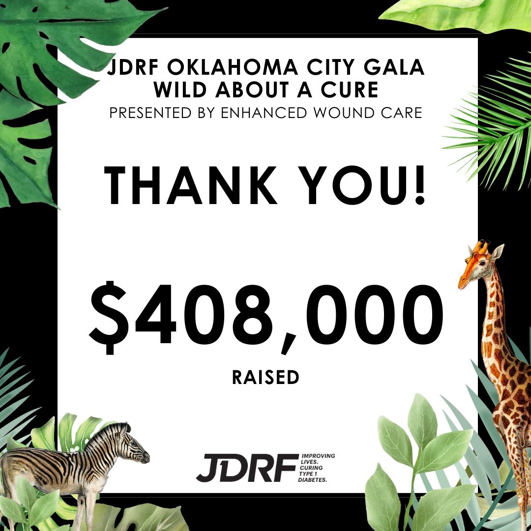 The Breakthrough T1D Oklahoma City Gala: Wild About A Cure, presented by Enhanced Wound Care on Saturday night, was an outstanding success, raising over $408,000! We extend our sincere appreciation to the Gala Honoree, Linda Zimmerman, the Gala Chairs, Laney and Brooks Ratzlaff, and the Fund A Cure Chairs, Taylor Tidwell and Shane Saunders, for their tremendous efforts in making this event truly unforgettable!