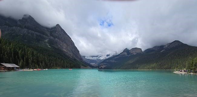 But I digress. Lake Louise is quite stunning. The water color is a fluorescent turquoise; I have never seen anything like it before. The mountains line the far shoreline with a glacier in the distance. Many tourists are canoeing throughout the lake. I proceed up the trail that leads to the Agnes Tea Room. This is a steep hill lined by tall pines on either side. Occasionally there is a break in the trees and you can see Lake Louise below. I still can’t get over the water color. Along the way I hit Mirror Lake which is more like a large pond but surrounded by large trees and mountains. I suspect on a sunny day the still water will truly reflect the surrounding scenery. I push on towards the top.
