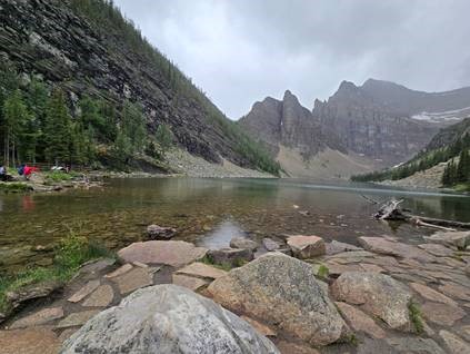 The summit is a 2.7 mile hike up 1258 ft. It takes me just under an hour to complete the hike. And at the top, there is the iconic Agnes Tea Room building. It looks like a small ski lodge with a few picnic tables scattered on the open porches. I wait in line for 20 minutes to get their signature Lake Agnus black tea. Honestly, it tasted like regular tea, but I enjoyed the idea of sipping a hot beverage while enjoying the scenery. I found the perfect rock that had an indentation for me to sit in and a flat part to rest my drink. It started to rain a bit, but I did not care. I put on my rain jacket and continued to relax in my rock-seat. Besides soaking in the beautiful Lake Agnes, it was fun to people watch. Kids would chase the nearly-tame chipmunk/squirrels. Dads were letting young kids dip their feet in the cold water. Other families debated resting here or moving on to the next hiking spot.