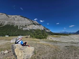 Day 7 is supposed to be a ride into Jasper National Park; however, wildfires just north of Jasper have shut everything down in that area. Our guides were quick on their feet and came up with an impromptu ride along the Saskatchewan River and into Abraham Lake. The first leg rides along the river as it necks down and expands across the rocky terrain. This part of the route is flat and I get to the break point fairly quickly. There is another rock with a “seat” cut-out which is perfect for stretching out to relax.