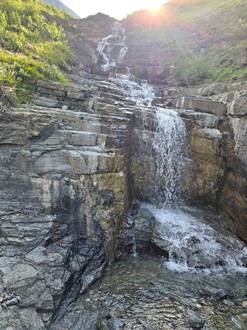 The ride is complete but the adventure is still underway. We travel by van to a trail head where we can see two cascading waterfalls. There is also a trail there to a lookout. I missed the memo that we were supposed to only look at the waterfall and not go on the hike. After 0.5 miles without seeing anyone I figured I better turn around. Yep, I was “that guy” who held up lunch for the group. After lunch we noticed on the drive the billowing smoke rising above the mountain. Those are not clouds; it is smoke. You can spot the hint of orange which is the fire itself burning. We are getting the heck-out-of-Dodge and heading to Banff.