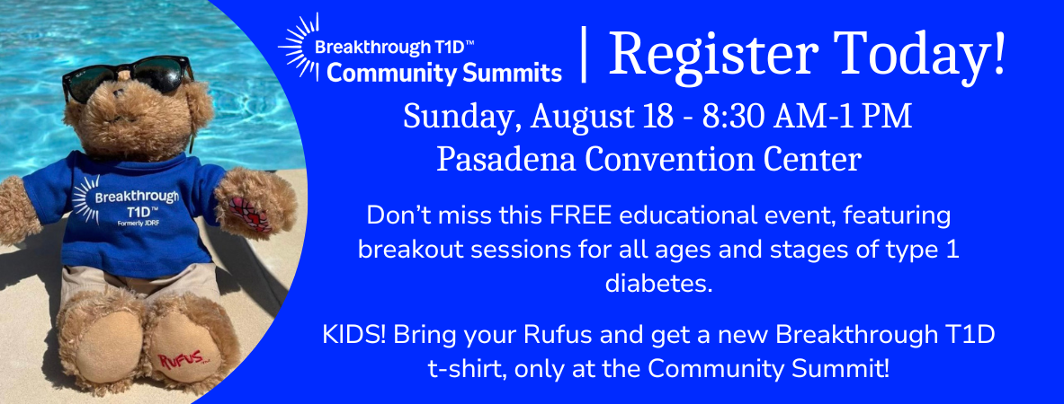 Join us on Sunday, August 18th, at the Pasadena Convention Center for our annual Breakthrough T1D Community Summit. This event is a FREE, in-person, educational summit, bringing together the type 1 diabetes community! Learn about research advances, participate in discussions with experts, talk with diabetes vendors and meet others living with or impacted by T1D. We will also have various breakout sessions for all ages and stages of type 1 diabetes, including discussions just for teens and a Kids Camp.