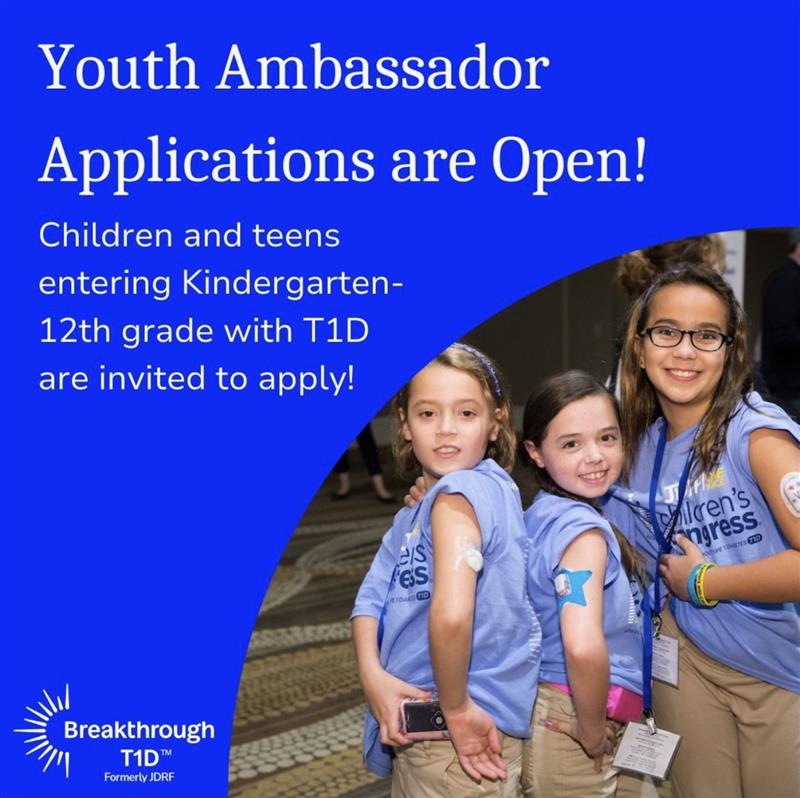 We hope you will apply for the Youth Ambassador Program. Visit the link below for additional YA program information and requirements as well as the Breakthrough T1D Youth Ambassador Program application form. Please submit your completed forms no later than August 31st. Click here to apply today!