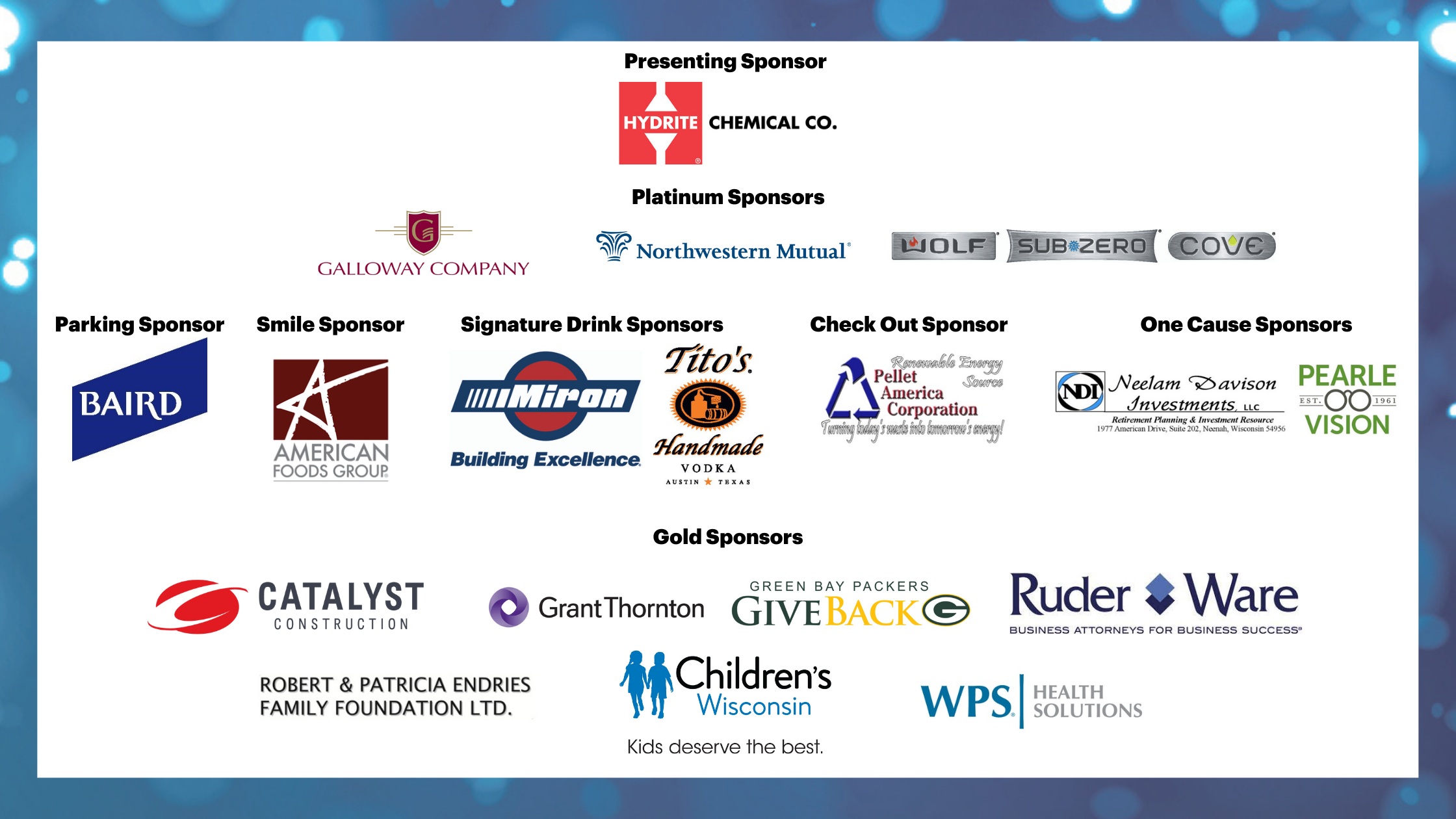 Silver Sponsors: Alvin L. Glick Foundation Inc., Associated Bank, Bank of Kaukauna, Corcoran Glass, Delta Dental of Wisconsin, First Business Bank, Foley & Lardner, Friends of Diabetes Research, Hiawatha National Bank, M3 Insurance, McCarty Law LLP, Mortgage Guaranty Insurance Company, MPC Advisors, Nicolet National Bank, Oshkosh Corporation, Prevea Health, Primary Care Associates of Appleton, Riley Construction, SC Johnson, Schneider Foundation, TASC, The Boldt Company, U.S. Bank- Appleton Main, U.S. Venture, UnitedHealthcare, UW Department of Surgery- Divsion of Transplantation, UW Health & Quartz, Walgreens, Wintrust Commercial Banking at Town Bank