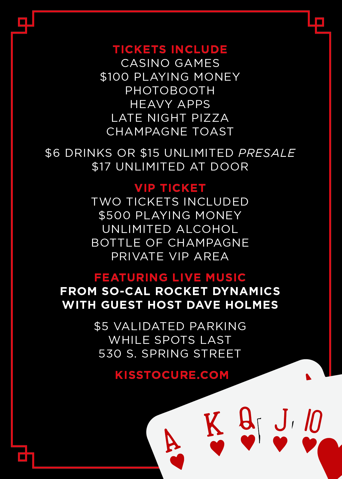 Kiss to Cure is The Los Angeles Young Leadership Committee’s (YLC) dynamic evening fundraiser. This event attracts over 200 guests, with online and print marketing materials reaching over 40,000. Kiss to Cure features live entertainment, a DJ, photo booth, full bar, food, dancing, and a silent auction. For its sixth annual year, guests will enjoy a Casino Royale theme with live casino games and entertainment. It is sure to be a ‘full house’ and an unforgettable evening.
