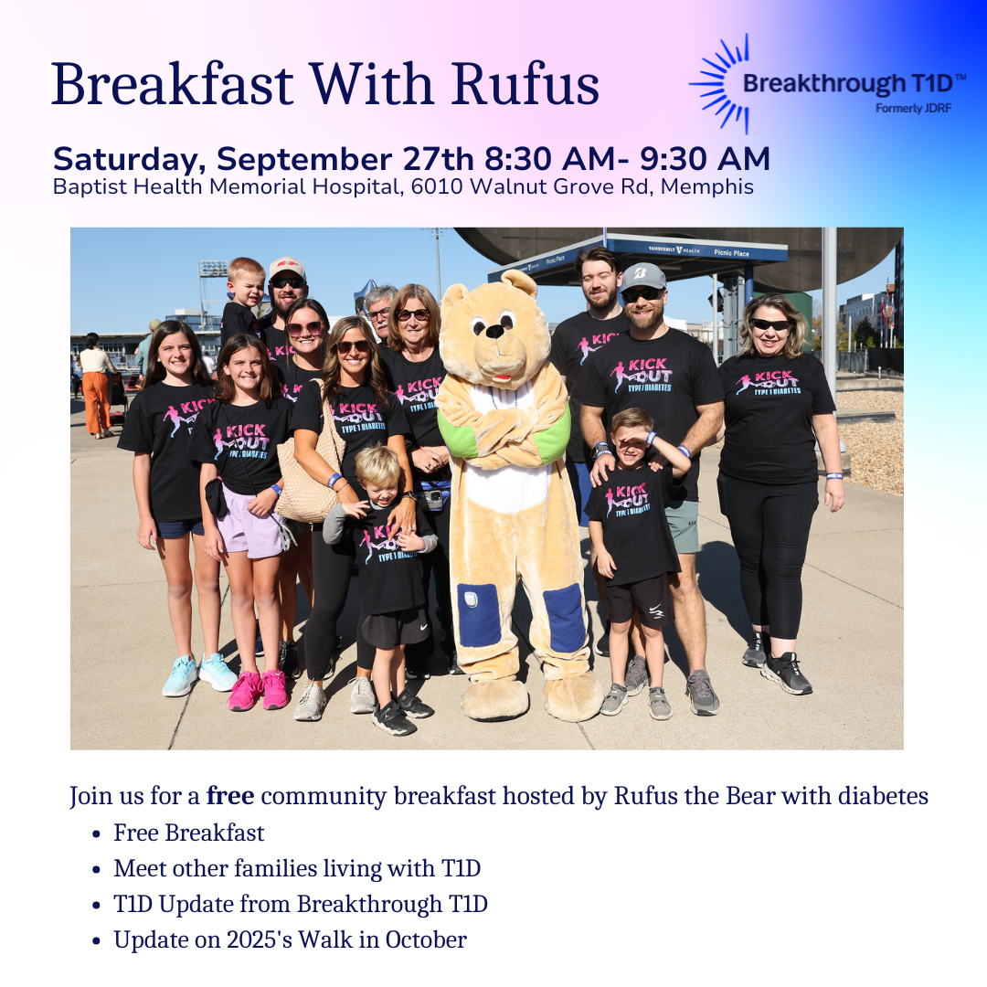 We’re thrilled to invite you and your family to our Breakfast with Rufus event on September 27th at the Baptist Health Memorial Hospital! Join Breakthrough T1D for a morning of community, fun, and inspiration as we come together to get a T1D update from Breakthrough T1D.