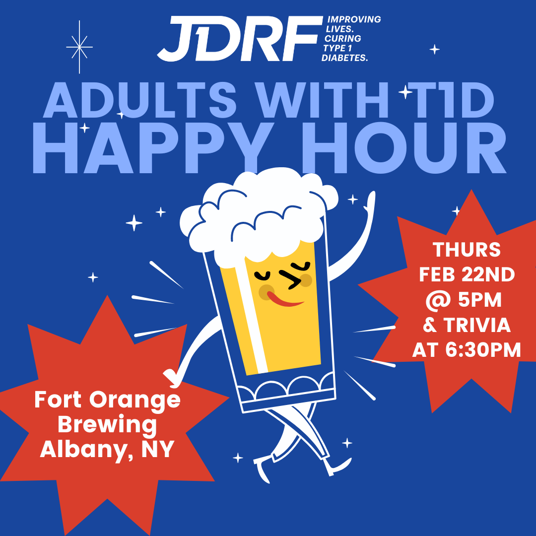 Join us on Feb. 22, 2024 at Fort Orange Brewing in Albany, NY to meet up with other adults who know what it’s like to live with T1D! We will be there starting at 5PM, and staying for Trivia starting at 6:30PM.