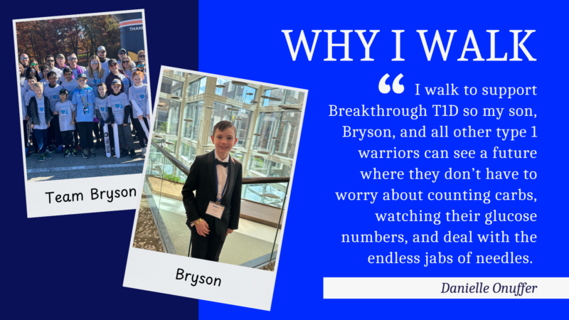 A: I walk to support Breakthrough T1D so my son, Bryson, and all other type 1 warriors can see a future where they don’t have to worry about counting carbs, watching their glucose numbers, and deal with the endless jabs of needles. We want to turn type 1 to type none!